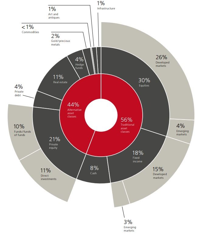 According to the UBS Global Family Office Report 2025, family offices now allocate around 44% of their portfolios to alternative investments — with private equity alone accounting for almost a quarter.